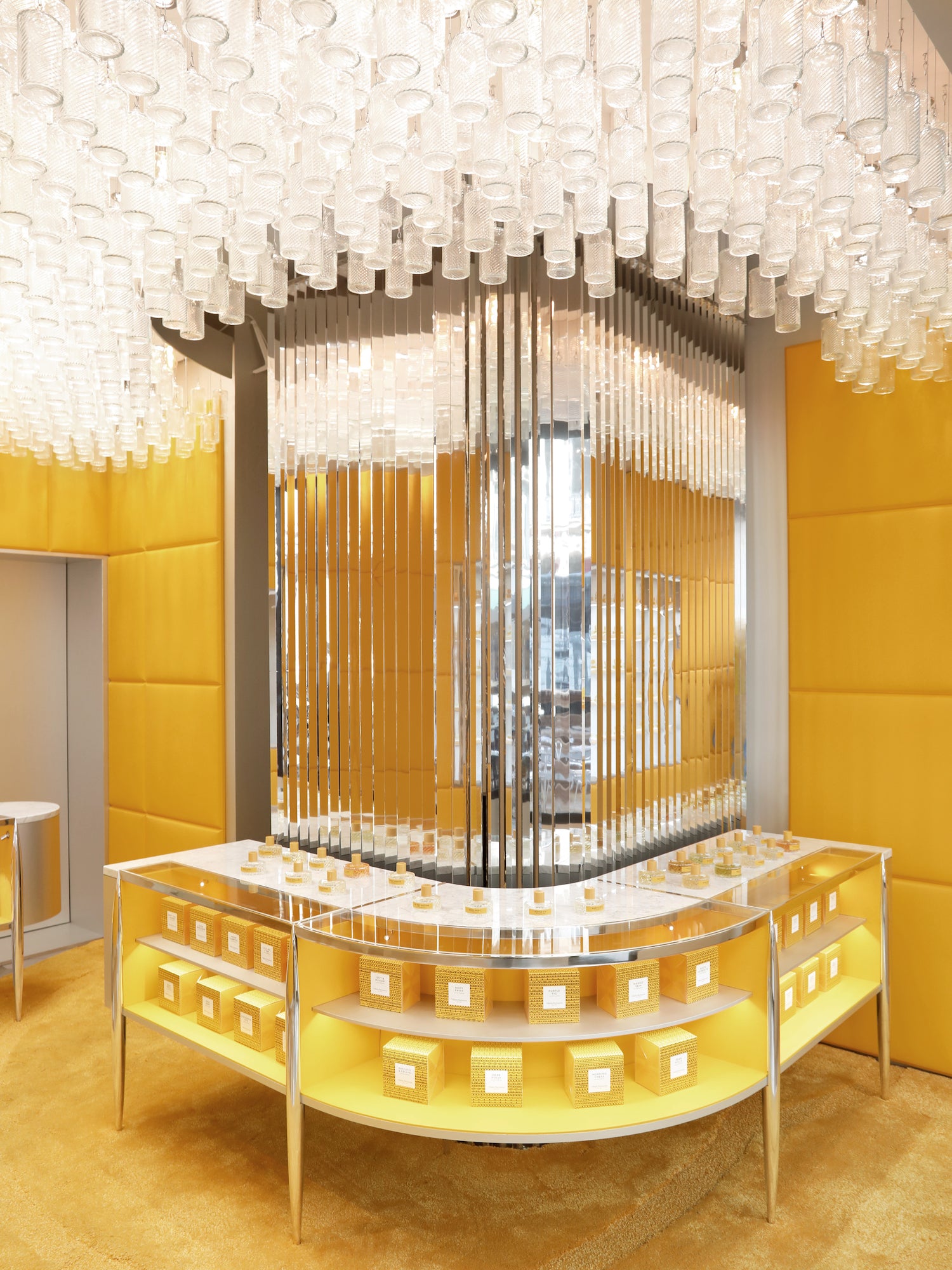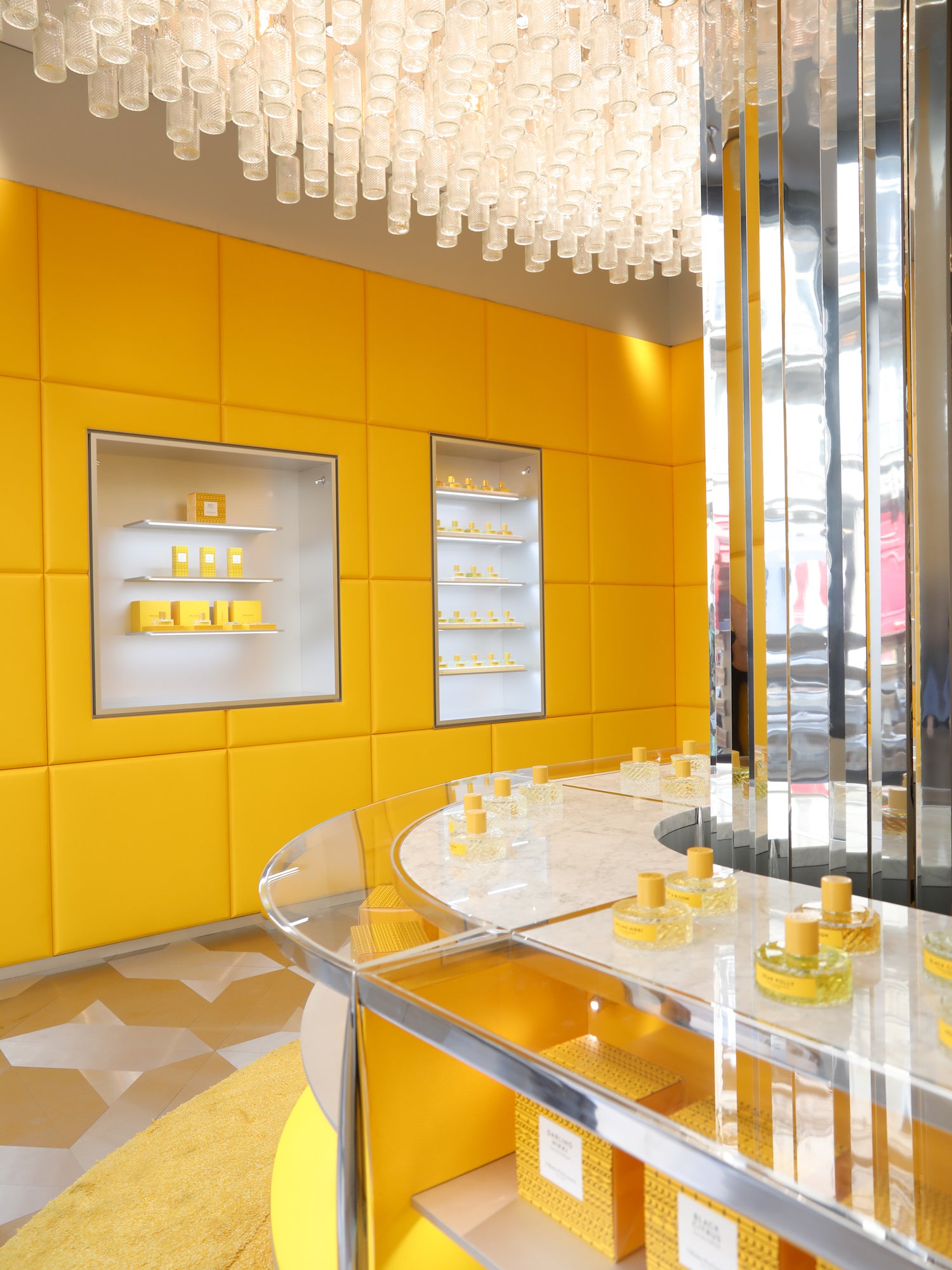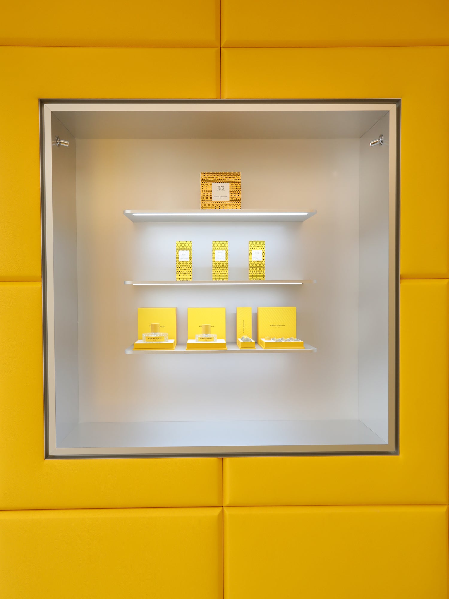 Wall panels wrapped in saffron yellow vegan leather - the brand's signature warm colour - stand out against the coldness of anodized aluminium niches. The brushed stainless steel floor is laid out like an old-fashioned Versailles parquet. The distinctly 1920s-inspired display cabinets, manufactured in Paris by Ateliers Artigo, with chrome pointed legs and Carrara marble to underline the delicacy of the fragrances.
